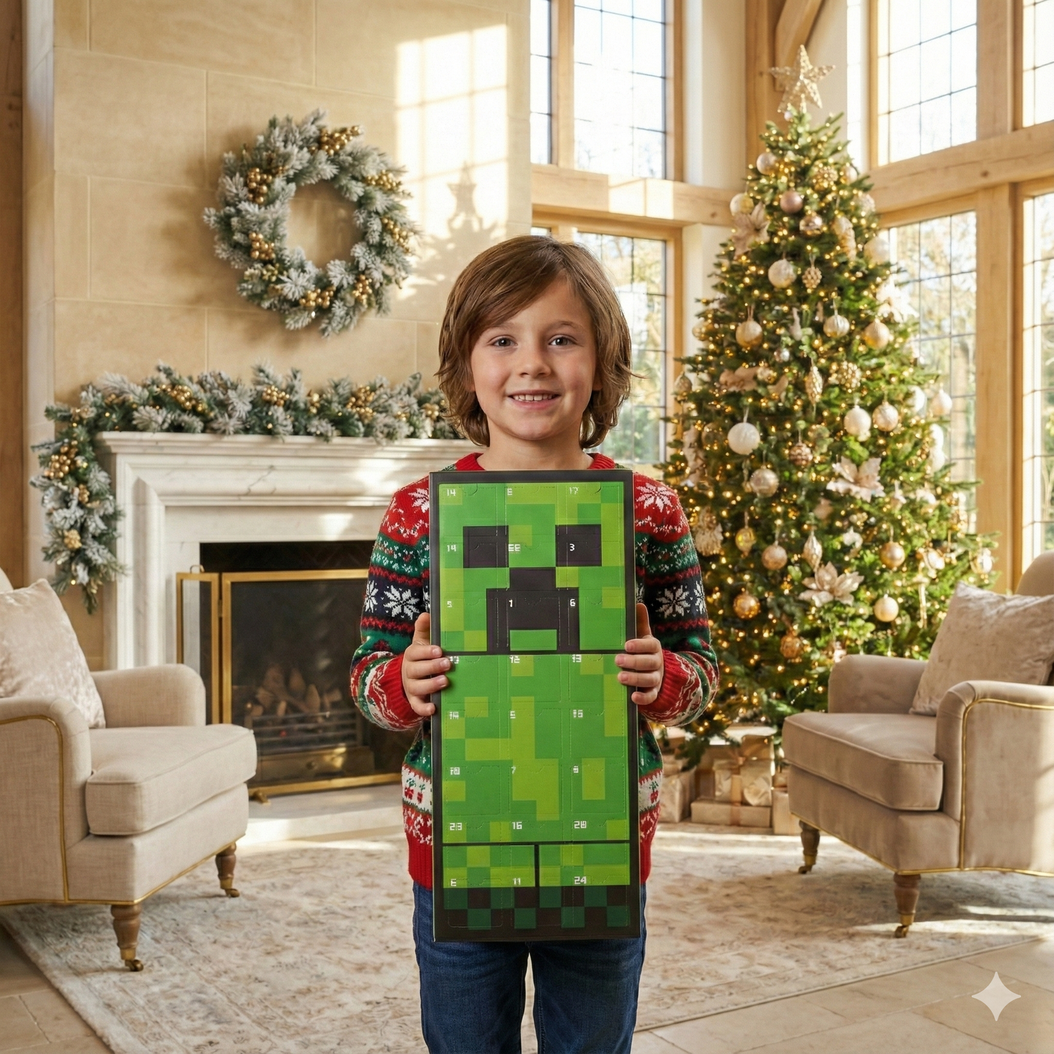 ✅ Nachher: ​​Geschenk: Minecraft-Adventskalender & personalisierte Socken. Reaktion: „Juhu! Ich bin die mit den Creepern!“ (Echte Freude 🤩)